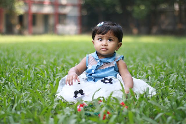 Photo of Baby Sitting On Grass. Photo by Freelancer Jowel: https://www.pexels.com/photo/photo-of-baby-sitting-on-grass-1666618/
