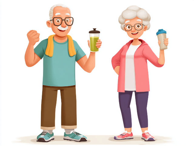 older adults doing exercise and taking nutritional drinks