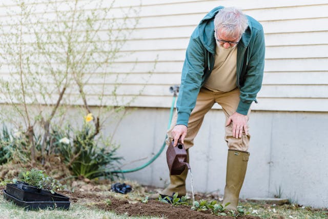 Photo by Greta Hoffman : https://www.pexels.com/photo/elderly-gardener-with-watering-can-against-wall-7728124/